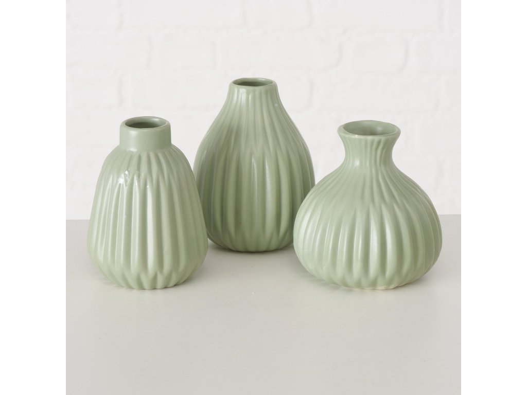- Různorodost tvarů: Váza je dostupná ve třech různých tvarech, což umožňuje vytvoření zajímavých kompozic. Můžete je kombinovat dohromady nebo používat jednotlivě, abyste dosáhli unikátního dekorativního efektu.