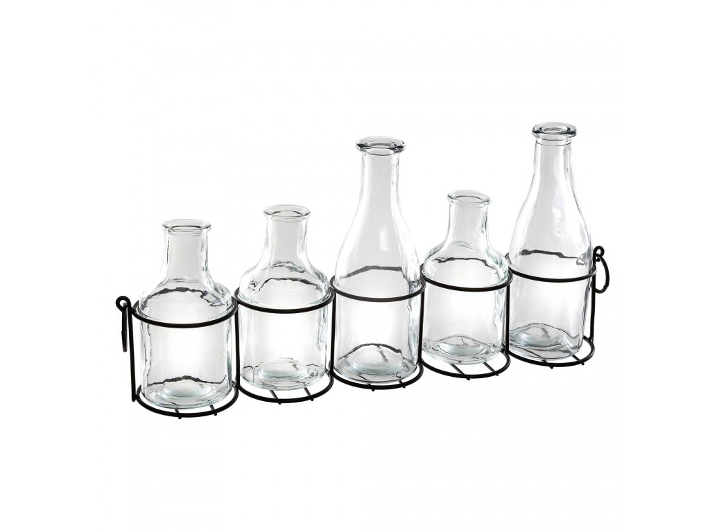 Skleněné vázy v kovovém stojanu, 5 kusů