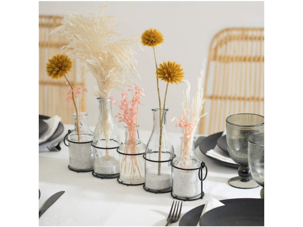 Skleněná váza v kovovém stojanu od uznávané značky Atmosphera, která vyrábí elegantní bytové doplňky, má průměr 6,4 cm, což umožňuje aranžovat do vázy drobné květiny nebo lodyhy rostlin. V balení najdete 5 váz a také kovový stojan. Rozměry výrobku jsou 38,6 x 7,7 x 19,5cm. Kvalitní sklo se spolu s kovovým stojanem stane příjemným doplňkem každého interiéru a minimalistický design obohatí vzhled a umožní vázy umístit kamkoli.