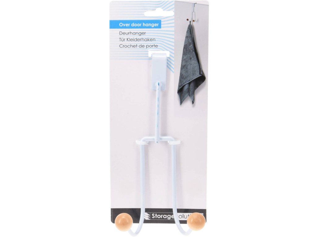 Věšák na dveře bílý, kov, 2 háčky s dřevěnými háčky, 19 x 9,5 x 10,5 cm