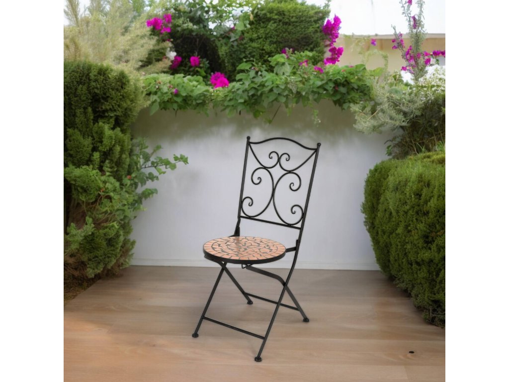 - Elegantní dekorativní opěradlo: Sedák židle je zdoben mozaikou v barvě cihel, což mu dodává eleganci a jedinečný charakter. Opěradlo je vyrobeno z kovu, který je ohnutý do dekorativních ozdob. To je neobyčejný dekorativní akcent pro každý odpočinkový prostor na čerstvém vzduchu.